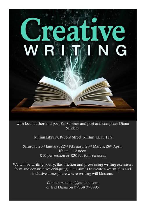 Ruthin Library Record Street, RuthinYsgrifennu Creadigol gyda'r awdur a'r bardd lleol Pat Sumner a'r bardd a'r gyfansoddwraig Diana Sanders. Llyfrgell Rhuthun, Record Street, Rhuthun LL15 1DS Byddwn yn ysgrifennu barddoniaeth, ffuglen fflach a rhyddiaith gan ddefnyddio ymarferion ysgrifennu, ffurf a beirniadaeth adeiladol. Ein prif nod yw creu awyrgylch cynnes, hwyliog a chynhwysol lle bydd ysgrifennu yn blodeuo.