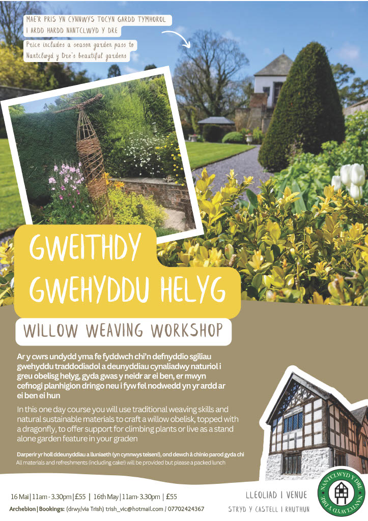 Nantclwyd y Dre Castle Street, Ruthin, Denbighshire, United KingdomAr y cwrs undydd yma fe fyddwch chi'n defnyddio sgiliau gwehyddu traddodiadol a deunyddiau cynaliadwy naturiol i greu obelisg helyg, gyda gwas y neidr ar ei ben, er mwyn cefnogi planhigion dringo neu i fym fel nodwedd yn yr ardd ar ei ben ei hun. Darperir yr holl ddeunyddiau a lluniaeth (yn cynnwys teisen!), ond […]